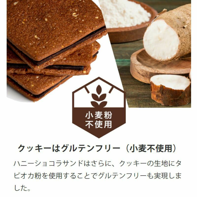 フィリングには天然・非加熱の生はちみつを使用しているため、GI値も低く(GI28)血糖値の上昇を緩やかにしてくれます。また、クッキーの生地にタピオカ粉を使用することでグルテンフリー(小麦粉不使用)も実現しました。