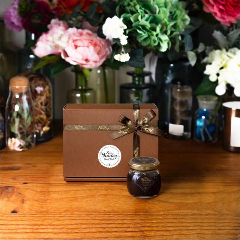 贈り物に最適なMYHONEYの生はちみつギフト 【当日出荷可能】ハニーショコラM(90g) / ブラウンギフトボックス(S) + MYHONEYロゴ入りリボン