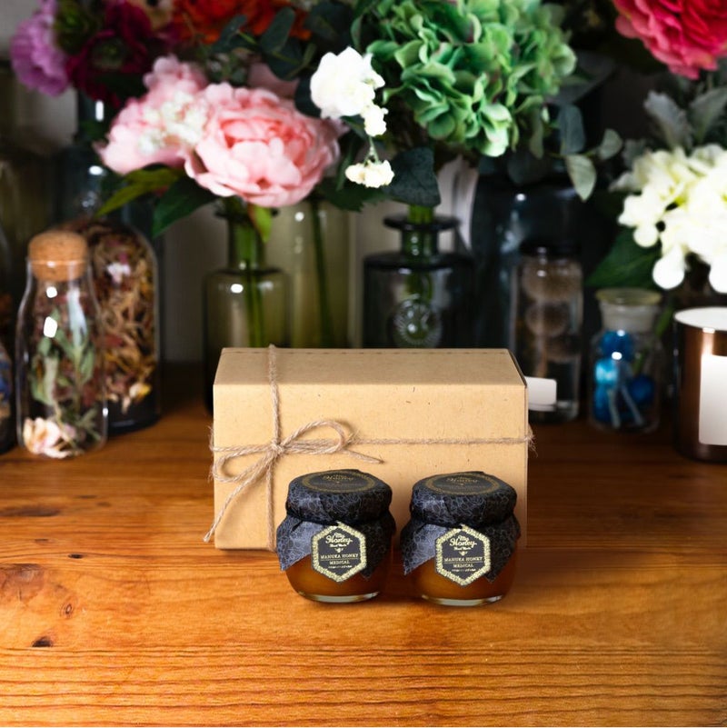 贈り物に最適なMYHONEYの生はちみつギフト マヌカハニー【MGO400+ (UMF13+相当)】(90g)× 2 / ナチュラルクラフトボックス(M) + 麻紐リボン【当日出荷可能】