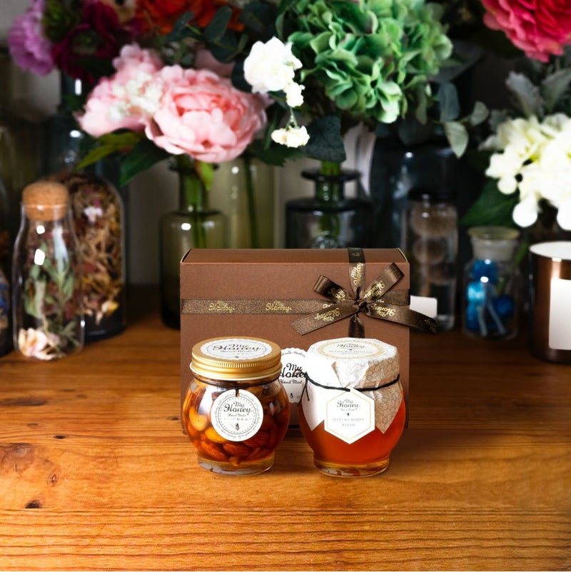 4. ナッツの蜂蜜漬けL(200g) + マヌカハニーブレンド(200g)【MGO30+相当】 / ブラウンギフトボックス(S) + MYHONEYロゴ入りリボン【当日出荷可能】